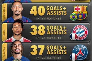 体育资讯11月10日讯 Score90统计了2025年五大联赛边锋在俱乐部+国家队比赛中参与进球的数量,并列出榜单。