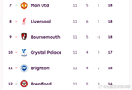 英超第3到12名之间只差4分,其中第5到第9名同积18分