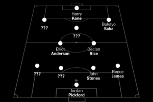 其中,皮克福德将是主力门将,里斯·詹姆斯是主力右后卫,斯通斯确定一个首发中卫位置;中场位置确定了赖斯、埃利奥特·安德森两个首发;前锋位置凯恩、萨卡稳坐首发。
