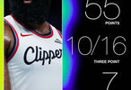 全场比赛,快船球星哈登出战35分钟,26中17,三分16中10得到55分3板7助攻1抢断。