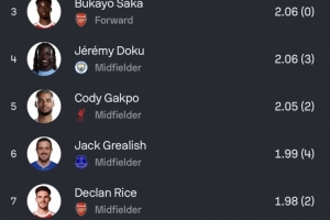 本赛季英超预期助攻排名(括号内为实际助攻):