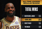 此役过后,詹姆斯的NBA生涯常规赛总胜场数达到1015场,超越罗伯特-帕里什升至NBA历史第二,仅次于卡里姆-阿布杜尔-贾巴尔的1074场。
