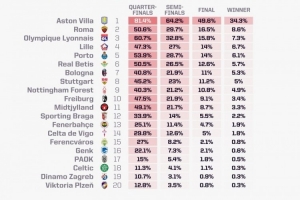 opta预测欧联杯:阿斯顿维拉夺冠概率34.3%,罗马8.6%第二