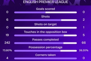 阿森纳上半场射门6次,射正0次,这是枪手本赛季英超首次上半场0射正。