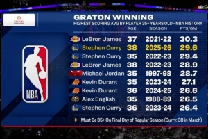 35+岁单赛季场均得分榜:詹姆斯30.3分最高 库里三次进前9
