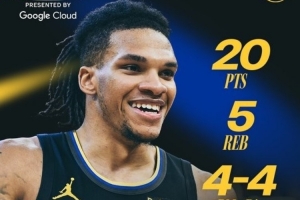 理查德本场比赛出战20分钟,7中6,三分4中4,罚球4中4超高效贡献20分5板(2前板)。