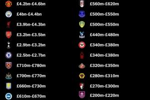 体育资讯12月27日讯 著名媒体《The Athletic》仔细研究了行业估算,查看了俱乐部最近的财务状况,并汇总了相关数据。包括TA在内,加上Football Benchmark、福布斯、Kinnaird和Sportico的估计数值汇总,他们给出了英超20队的价值区间。