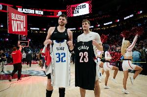 体育资讯12月31日讯 昨日开拓者主场125-122险胜独行侠,赛后克林根和弗拉格交换了球衣。