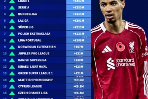 2025年欧洲联赛身价涨跌榜:英超上涨10亿9000万欧第一,法甲第二