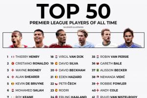 你认可吗英媒评英超历史50大球星:亨利第1 C罗第2 萨拉赫第6