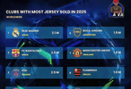 2025足坛球衣销量榜出炉:皇萨霸榜前二 梅西带飞迈阿密跻身前五