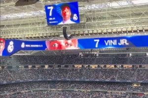 体育资讯1月4日讯 皇家马德里对阵皇家贝蒂斯的比赛正在进行当中,赛前伯纳乌播报球员名字时,球迷们给予维尼修斯欢呼。